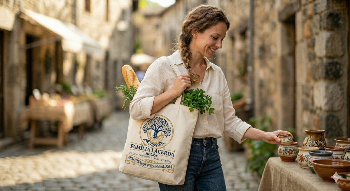 O design da ecobag apresenta o brasão da Família Lacerda em destaque, com a árvore da vida, o brasão de armas e a frase "FAMÍLIA LACERDA - RAÍZES E HISTÓRIA". O fundo é composto por um jardim arborizado e uma parede de pedra, transmitindo uma sensação de tradição e sofisticação.